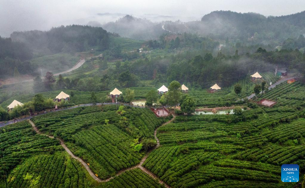 Aerial photo taken on Sept. 8, 2022 shows a tea garden in Ningqiang County, northwest China's Shaanxi Province. As the headwater region of the Hanjiang River, the largest tributary of the Yangtze River, Ningqiang County has closed ten mines and promoted a series of ecological protection projects for environmental protection in recent years. The county has also promoted the production of agricultural products including tea, fruits, vegetables, etc., managing and transforming ecological resources to green economy. (Xinhua/Tao Ming)