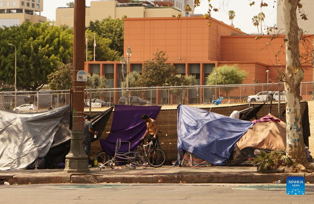 Tents housing the homeless line the sidewalk of a street in downtown Los Angeles, California, the United States, on Sept. 8, 2022. An estimated 69,144 people are experiencing homelessness in Los Angeles, the most populous county in the United States, according to the results of the 2022 Homeless Count released by the Los Angeles Homeless Services Authority (LAHSA) on Thursday. (Photo by Zeng Hui/Xinhua).