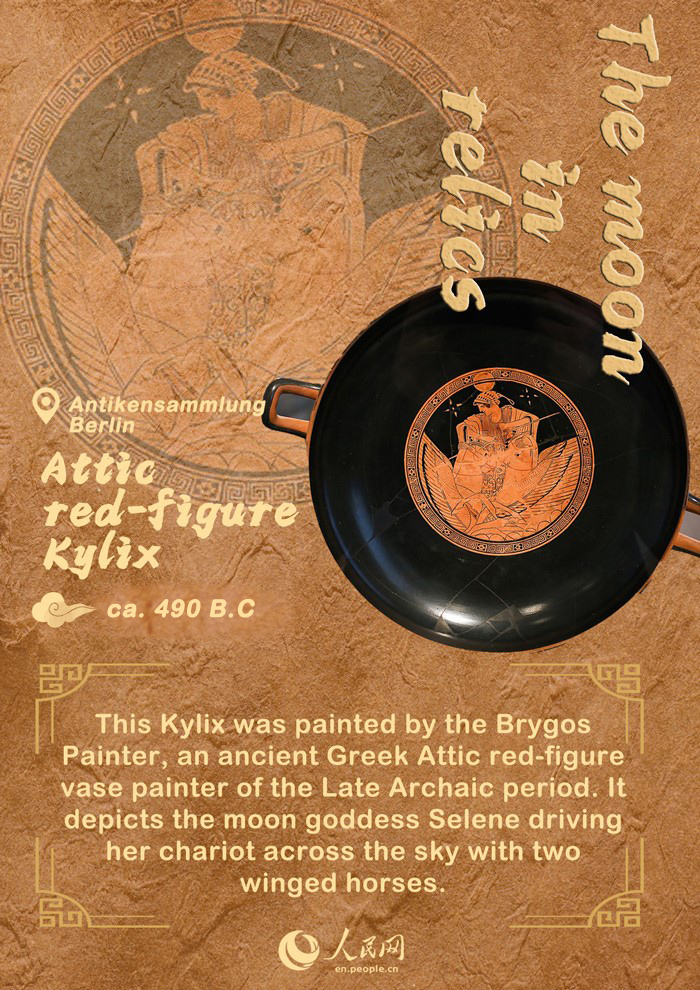 This Kylix, a shallow two-handled wine drinking cup, was painted by the Brygos Painter, an ancient Greek Attic red-figure vase painter of the Late Archaic period. It depicts the moon goddess Selene driving her chariot across the sky with two winged horses. She can be seen wearing a nightcap, with the moon atop her head like a glowing crown. This Kylix is now being displayed in Antikensammlung Berlin, Germany.