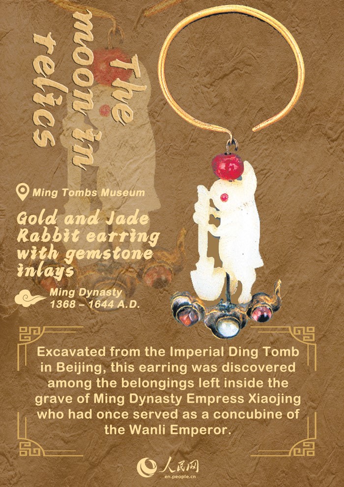 Excavated from the Imperial Ding Tomb in Beijing, this earring was discovered among the belongings left inside the grave of Ming Dynasty Empress Xiaojing of the Wanli Emperor. This pair of earrings features a Jade Rabbit making medicine, a traditional mythical animal in China associated with the moon.
