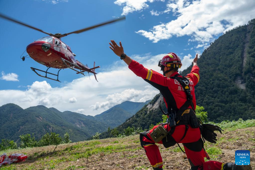 A rescuer guides a helicopter in Xingfu Village of Shimian County, Ya'an City, southwest China's Sichuan Province, Sept. 10, 2022. (Xinhua/Cai Yang)