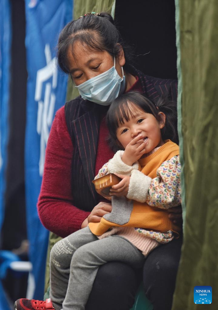 Villagers have a meal outside a tent in Xingfu Village of Shimian County, Ya'an City, southwest China's Sichuan Province, Sept. 10, 2022. (Xinhua/Cai Yang)