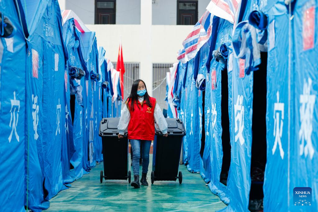 Luo Lian helps collecting garbage at the quake relief shelter of Luding No. 2 high school in Luding County, southwest China's Sichuan Province, Sept. 10, 2022. Luo Lian, 32, is a kindergarten teacher in Lengqi Town of Luding County.
