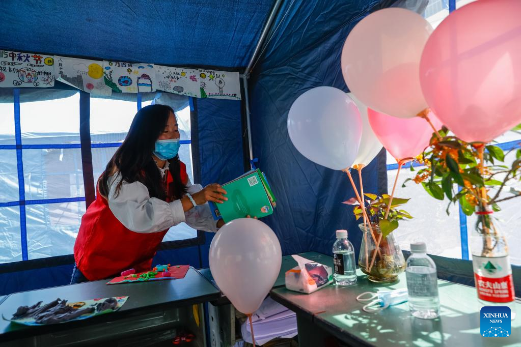 Luo Lian arranges books in a tent classroom at the quake relief shelter of Luding No. 2 high school in Luding County, southwest China's Sichuan Province, Sept. 10, 2022. Luo Lian, 32, is a kindergarten teacher in Lengqi Town of Luding County.