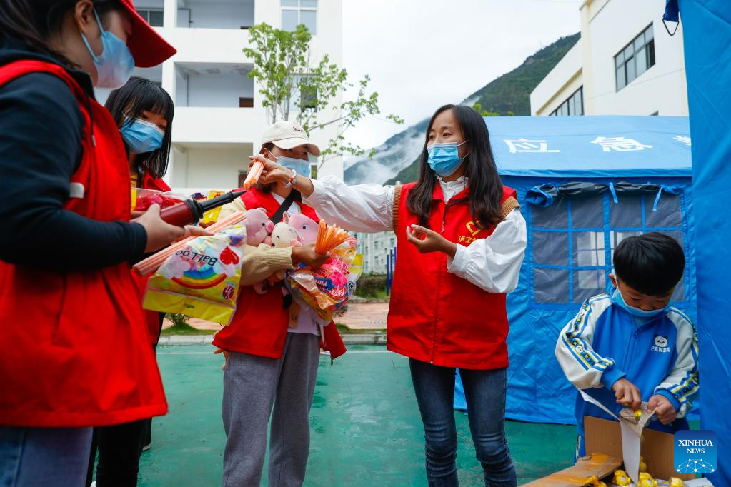 Luo Lian (2nd R) and her 4-year-old son prepare toys and balloons for the kids at the quake relief shelter of Luding No. 2 high school in Luding, southwest China's Sichuan Province, Sept. 10, 2022. Luo Lian, 32, is a kindergarten teacher in Lengqi Town of Luding County.