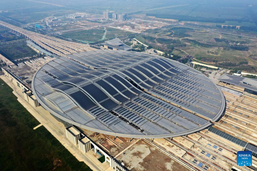 Aerial photo taken on Sept. 9, 2022 shows a distributed photovoltaic (PV) power station on the rooftop of the Xiong'an Railway Station in Xiong'an New Area, north China's Hebei Province. (Xinhua/Zhu Xudong)