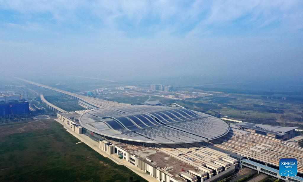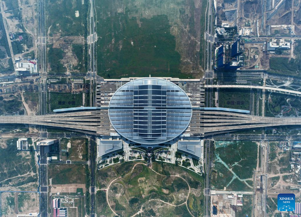 Aerial photo taken on Sept. 9, 2022 shows the Xiong'an Railway Station in Xiong'an New Area, north China's Hebei Province. (Xinhua/Zhu Xudong)