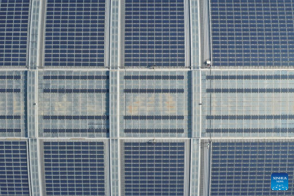 Aerial photo taken on Sept. 9, 2022 shows a distributed photovoltaic (PV) power station on the rooftop of the Xiong'an Railway Station in Xiong'an New Area, north China's Hebei Province. (Xinhua/Xing Guangli)