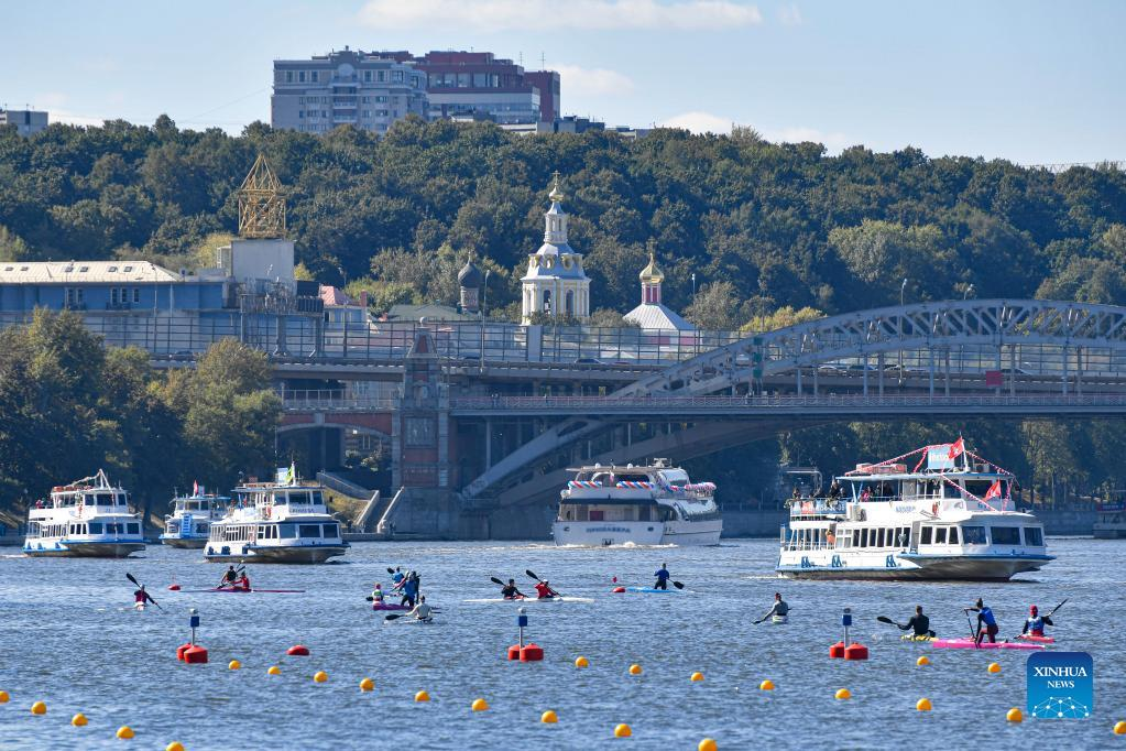 Athletes take part in a dragon boat event during Moscow City Day celebrations in Moscow, Russia, Sept. 10, 2022. A series of events were held on Saturday to celebrate Moscow City Day, marking the city's 875th founding anniversary. (Photo by Alexander Zemlianichenko Jr/Xinhua)