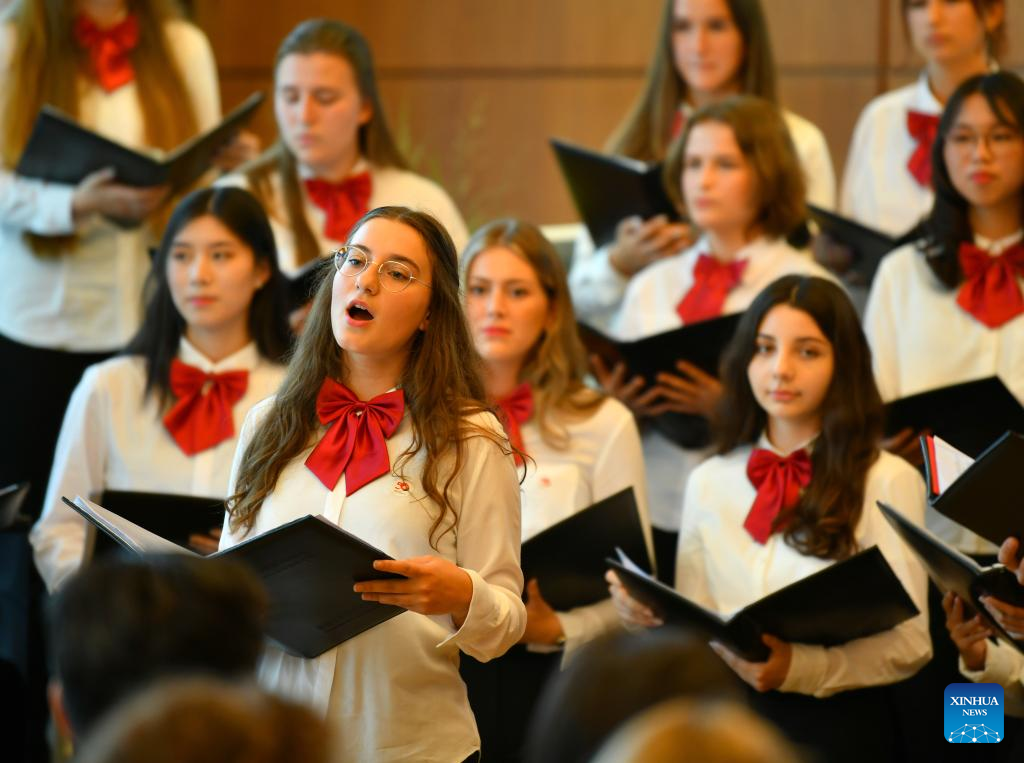 Members of Burg Chinese Chorus perform during the cloud concert to celebrate the 50th anniversary of diplomatic relations between China and Germany in Essen, Germany, on Sept. 10, 2022. A cloud concert sung by youth from China and Germany was held here on Saturday to celebrate the 50th anniversary of diplomatic relations between the two countries. (Xinhua/Ren Pengfei)