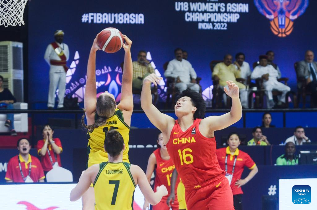 Ge Jiaying (R) of China and Isla Juffermans of Austalia vie for the ball during the final match at the FIBA U18 Women's Asian Basketball Championship in Bengaluru, India, Sept. 11, 2022. (Str/Xinhua)