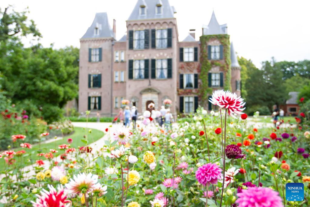 Photo taken on Sept. 11, 2022 shows dahlia flowers in front of the Keukenhof Castle in Lisse, the Netherlands. (Photo by Sylvia Lederer/Xinhua)