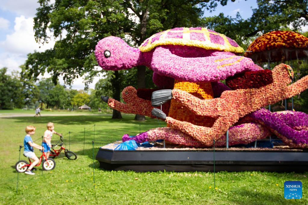 Children view a flower float of dahlia at the Keukenhof Castle in Lisse, the Netherlands, on Sept. 11, 2022. (Photo by Sylvia Lederer/Xinhua)