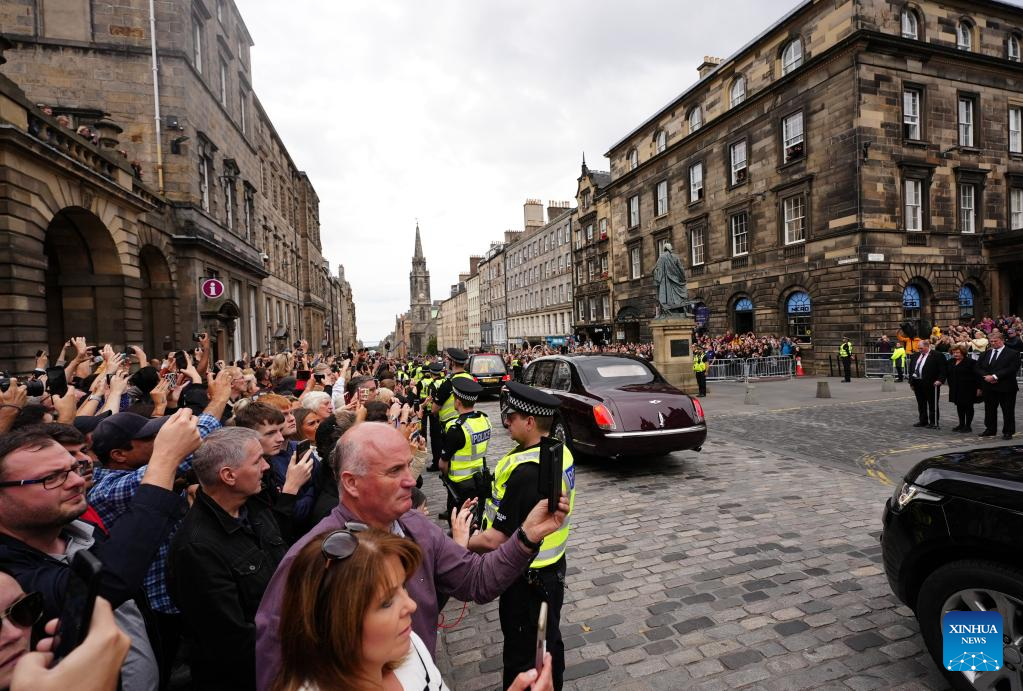 The hearse carrying the coffin of Queen Elizabeth II is seen in Edinburgh, Britain, Sept. 11, 2022. The hearse carrying the body of Queen Elizabeth II left Balmoral Castle and arrived at Edinburgh on Sunday. (Photo by Zhang Ruijun/Xinhua)