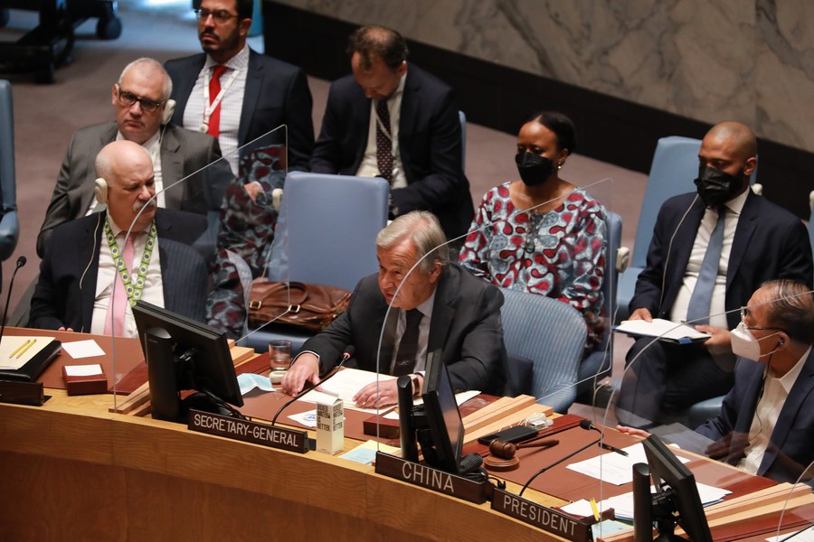 UN Secretary-General Antonio Guterres (C, front) speaks at a UN Security Council briefing on the situation in Ukraine at the UN headquarters in New York, Aug. 24, 2022. (Xinhua/Xie E)