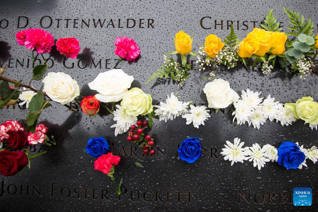Flowers are placed on a plate inscribed with the names of 9/11 victims at the National September 11 Memorial and Museum in New York, the United States, on Sept. 11, 2022. Sunday marked the 21st anniversary of the 9/11 attacks. (Photo by Michael Nagle/Xinhua)