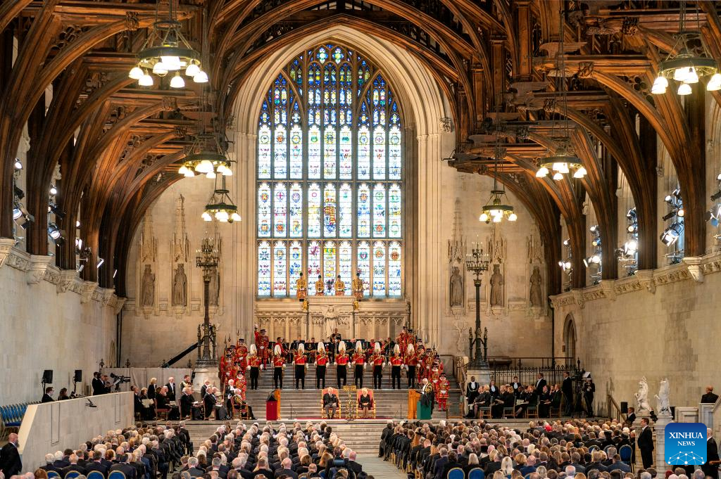 Photo taken on Sept. 12, 2022 shows a view before Britain's King Charles III delivering his first address to the parliament in Westminster Hall in London, Britain. Britain's King Charles III said he felt "the weight of history" and vowed to follow the example set by his late mother, Queen Elizabeth II, in his first address to the parliament on Monday. (Annabel Moeller/UK Parliament/Handout via Xinhua)