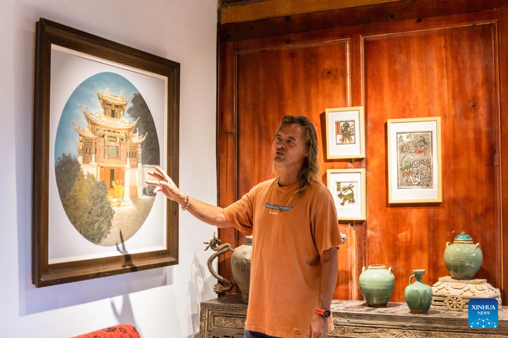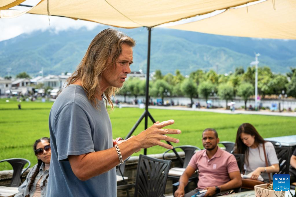 Brian Linden introduces local culture to tourists in the Linden Center in Xizhou old town, southwest China's Yunnan Province, Aug. 27, 2022. (Xinhua/Cao Mengyao)
