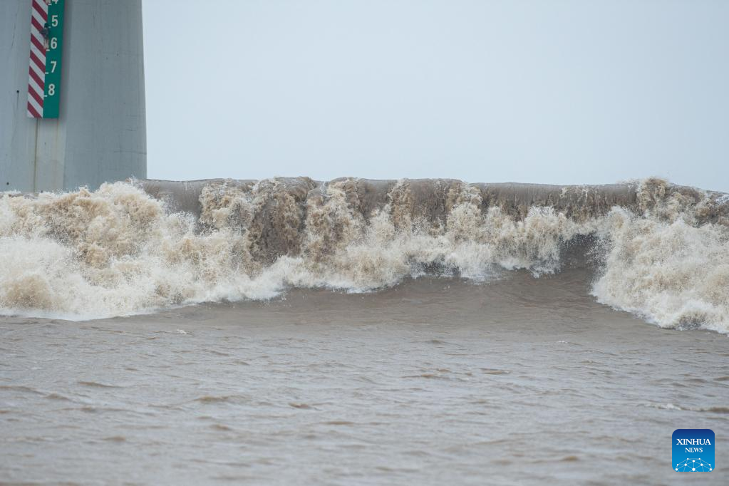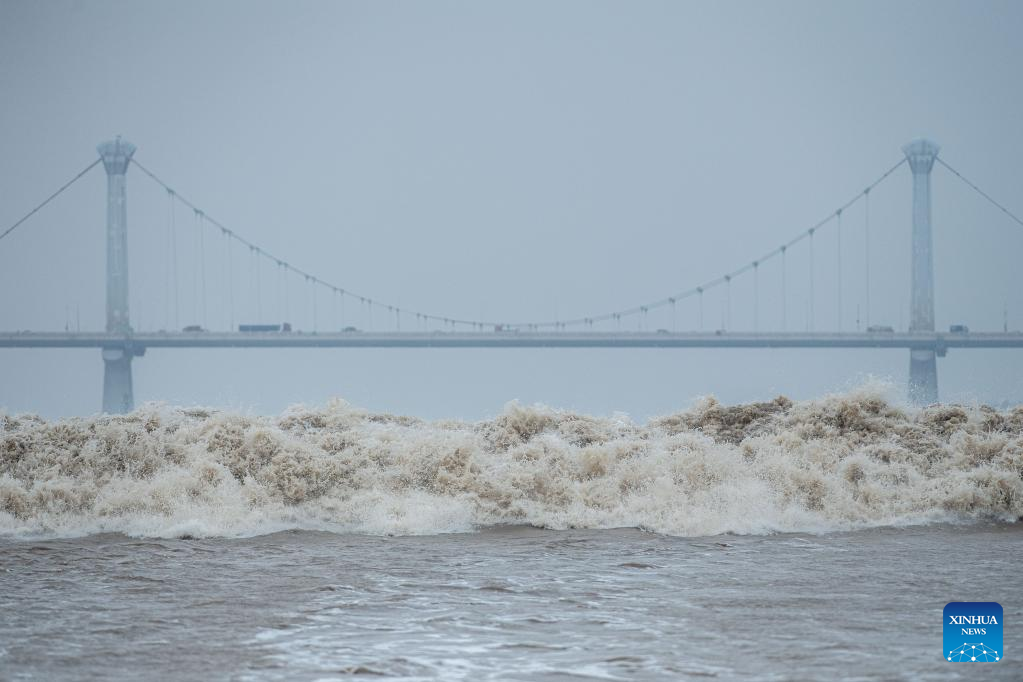 Billows are seen as a tidal bore hits banks of the Qiantang River in Hangzhou, east China's Zhejiang Province, on Sept. 13, 2022. The Qiantang River tidal bore, famous for its height and speed, is a traditional tourist attraction here. (Xinhua/Jiang Han)
