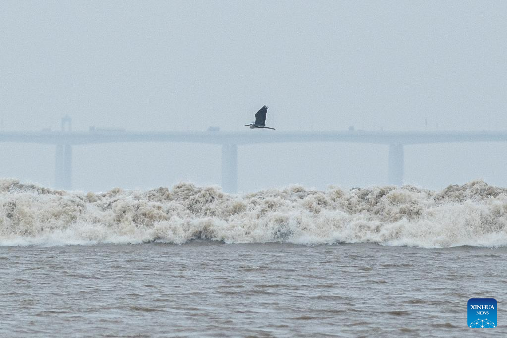 A bird flies over a tidal bore of the Qiantang River in Hangzhou, east China's Zhejiang Province, on Sept. 13, 2022. The Qiantang River tidal bore, famous for its height and speed, is a traditional tourist attraction here. (Xinhua/Jiang Han)