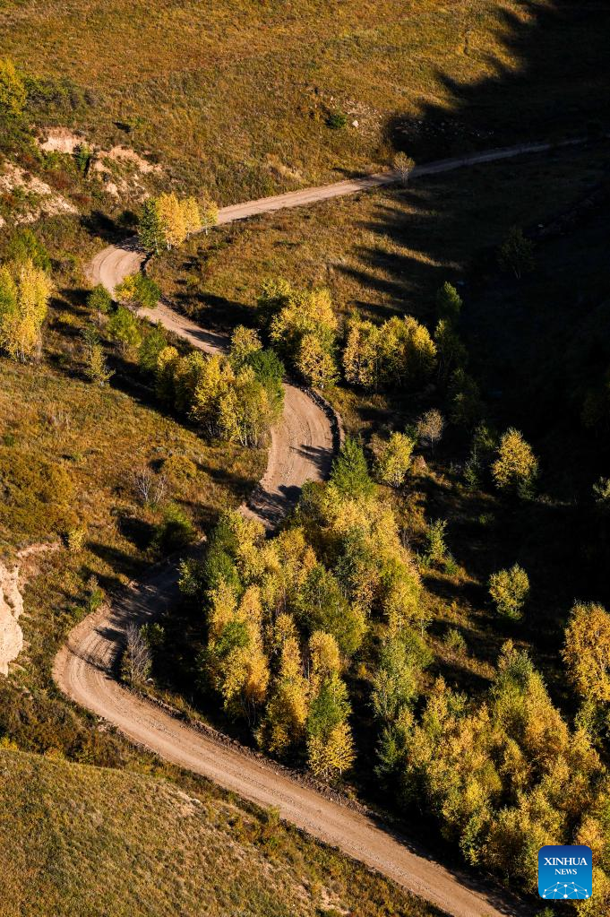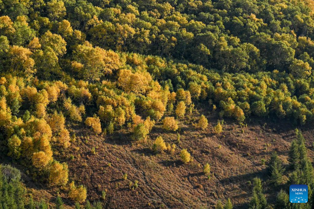 Aerial photo taken on Sept. 13, 2022 shows the autumn scenery of Daqing Mountain in Hohhot of north China's Inner Mongolia Autonomous Region. (Xinhua/Lian Zhen)