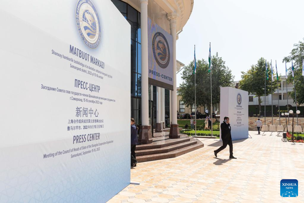 Photo taken on Sept. 14, 2022 shows an exterior view of the press center for the upcoming 22nd meeting of the Council of Heads of State of the Shanghai Cooperation Organization (SCO) in Samarkand, Uzbekistan. (Xinhua/Bai Xueqi)