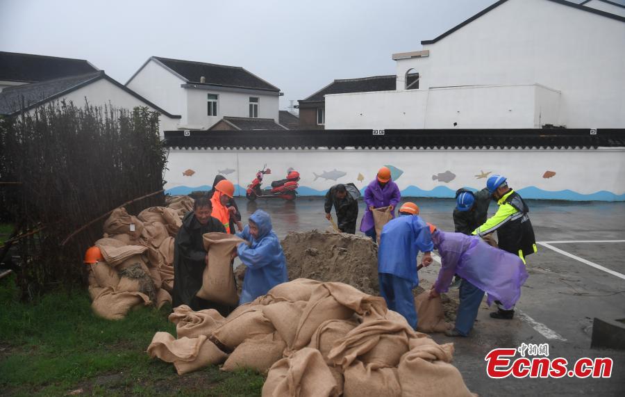 Staff members prepare sandbags to prevent river water from flowing backward as Typhoon Muifa approaches Zhoushan, east China's Zhejiang Province, Sept. 14, 2022. (Photo: China News Service/Wang Gang)