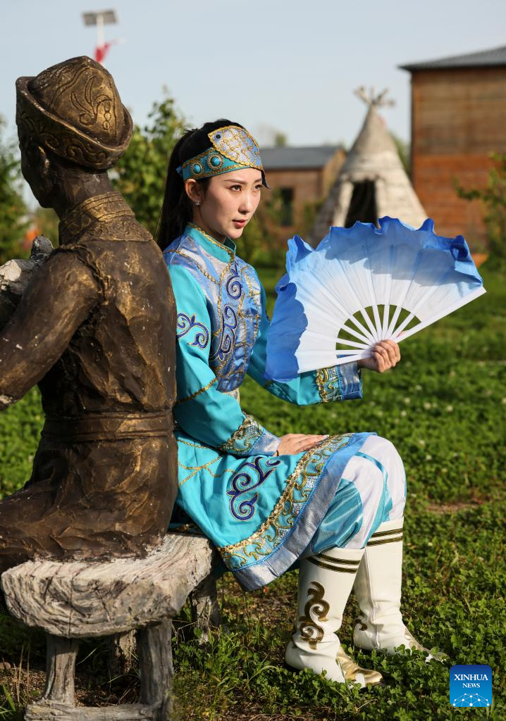 Shang Meihan, dressed in folk costume, poses for photos in the Hezhe ethnic village of Zhuaji in Wusu Township of Fuyuan City, northeast China's Heilongjiang Province, Sept. 4, 2022.