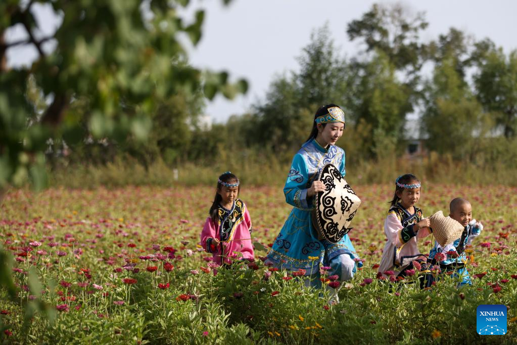 Shang Meihan spends time with local children at a flower field in the Hezhe ethnic village of Zhuaji in Wusu Town of Fuyuan City, northeast China's Heilongjiang Province, Sept. 4, 2022.