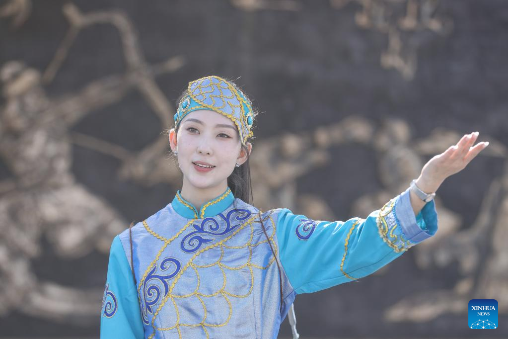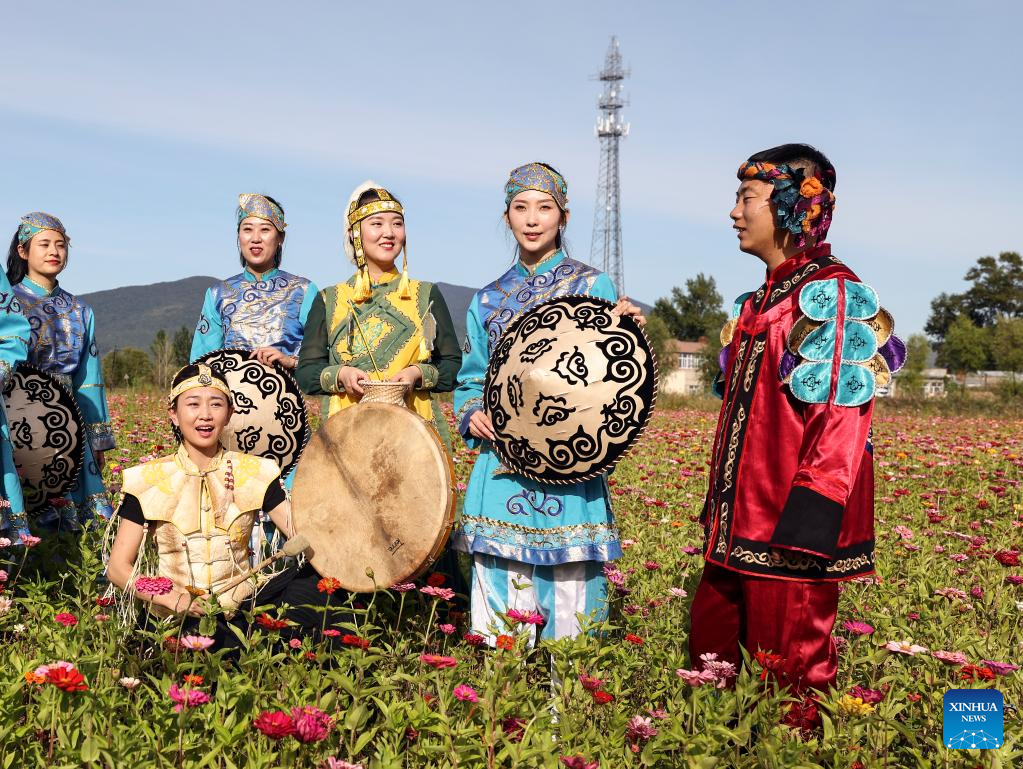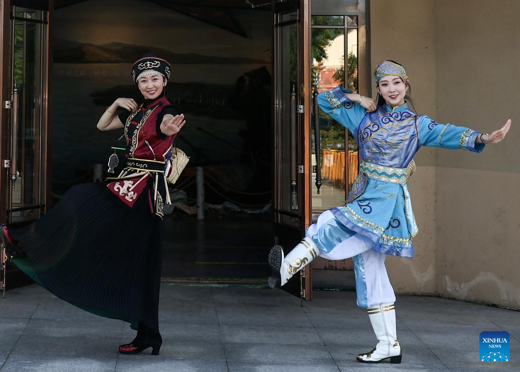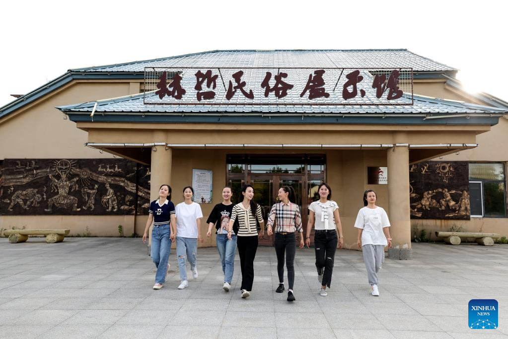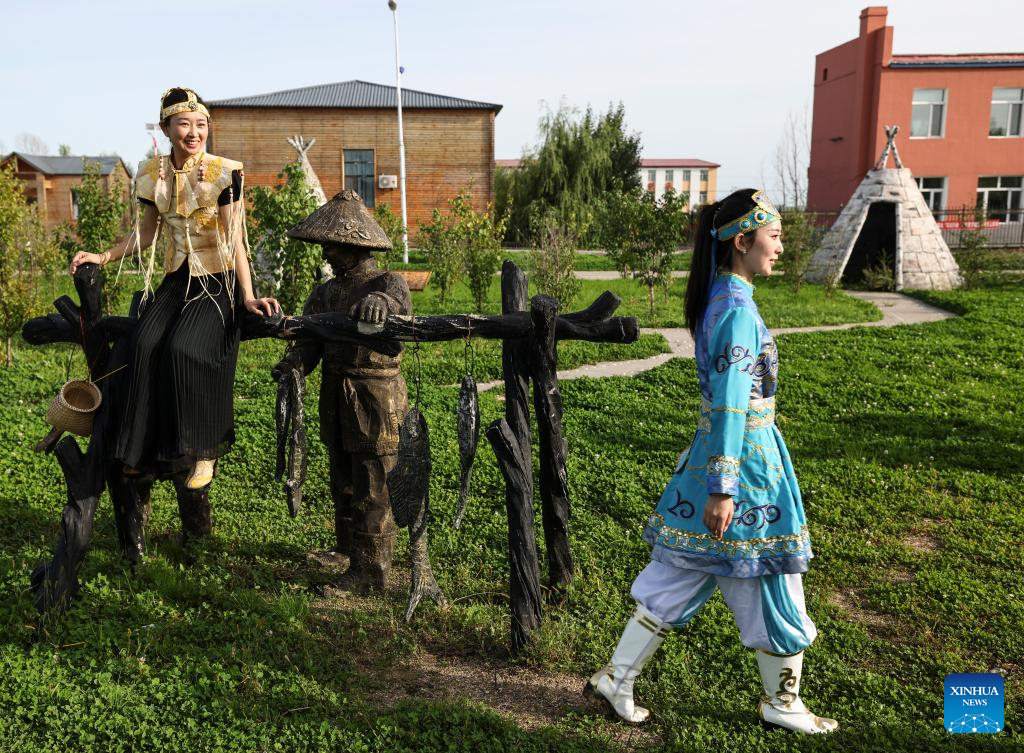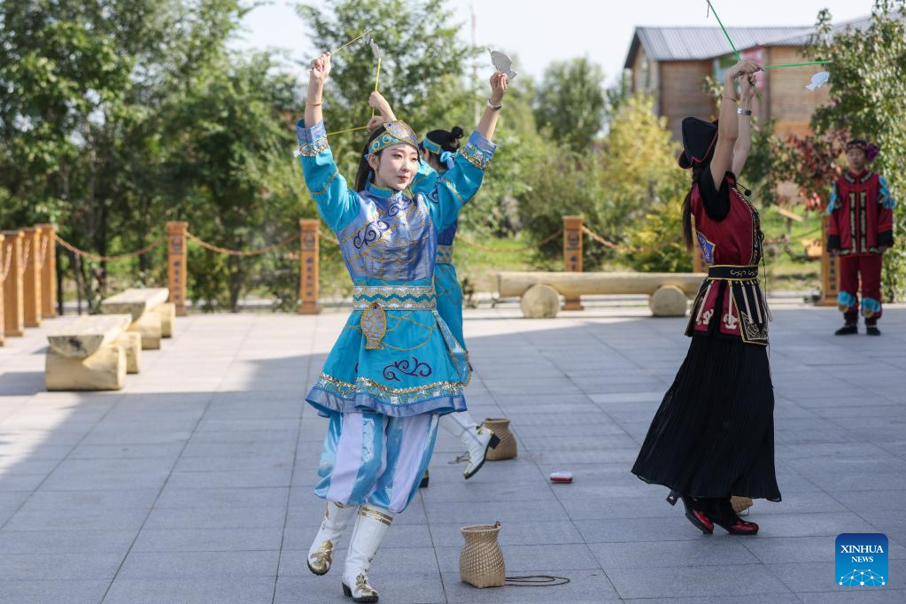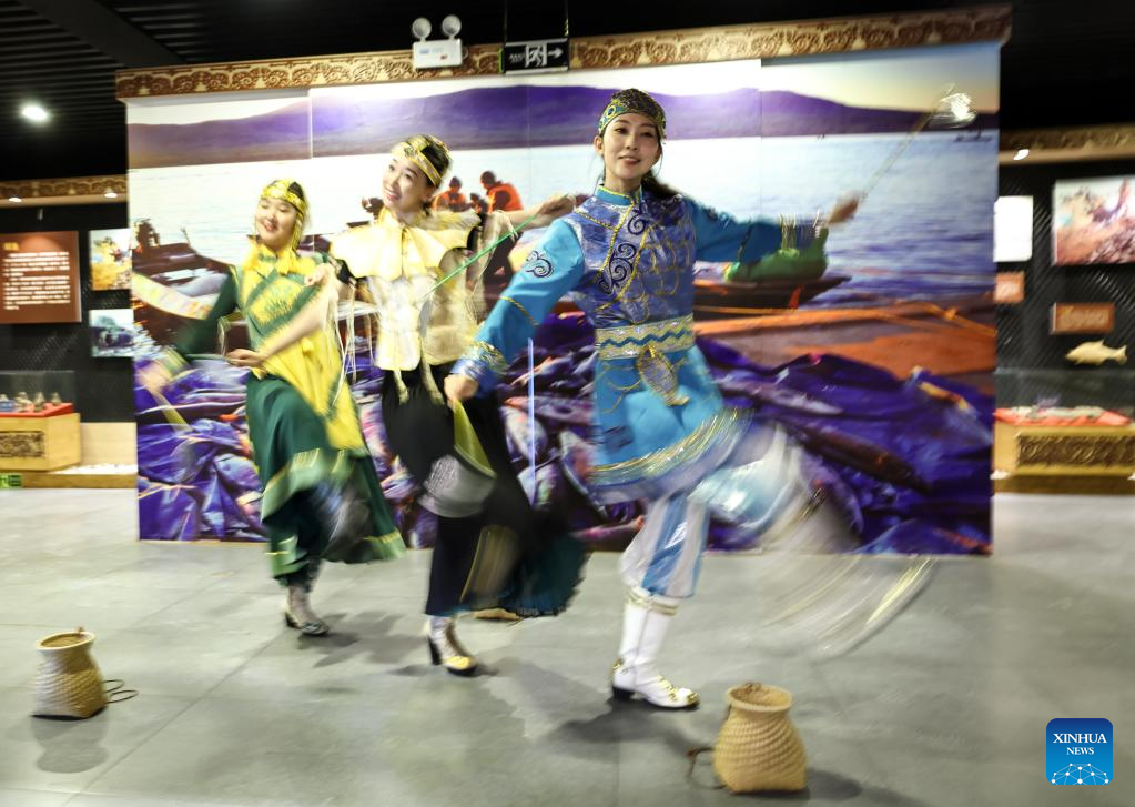 Shang Meihan (1st R) performs a dance with other performers at a folk exhibition hall in the Hezhe ethnic village of Zhuaji in Wusu Township of Fuyuan City, northeast China's Heilongjiang Province, Sept. 4, 2022.