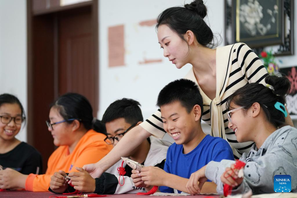 Shang Meihan instructs children to make handicrafts in the Hezhe ethnic village of Zhuaji in Wusu Township of Fuyuan City, northeast China's Heilongjiang Province, Sept. 7, 2022.