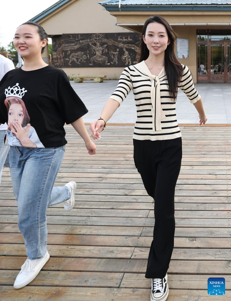 Shang Meihan (2nd R) rehearses a dance with other performers in the Hezhe ethnic village of Zhuaji in Wusu Township of Fuyuan City, northeast China's Heilongjiang Province, Sept. 4, 2022.