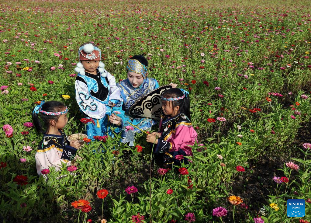 Shang Meihan (2nd L) spends time with local children at a flower field in the Hezhe ethnic village of Zhuaji in Wusu Town of Fuyuan City, northeast China's Heilongjiang Province, Sept. 4, 2022.