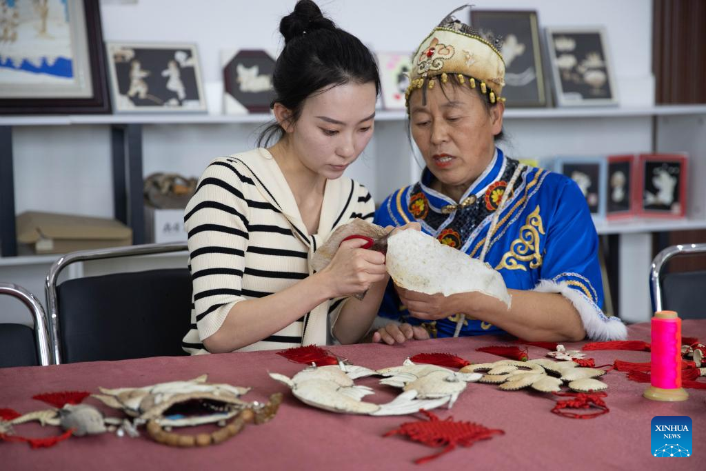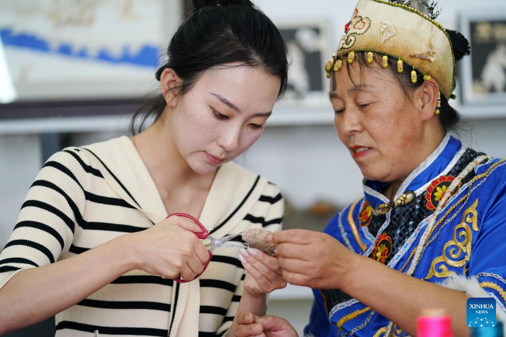 Shang Meihan (L) learns to make a traditional fish-skin handicraft from an experienced artisan in the Hezhe ethnic village of Zhuaji in Wusu Town of Fuyuan City, northeast China's Heilongjiang Province, Sept. 7, 2022.
