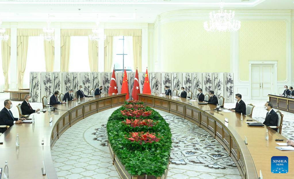 Chinese President Xi Jinping meets with President Recep Tayyip Erdogan of Trkiye at Forumlar Majmuasi Complex in Samarkand, Uzbekistan, Sept. 16, 2022. (Xinhua/Shen Hong)
