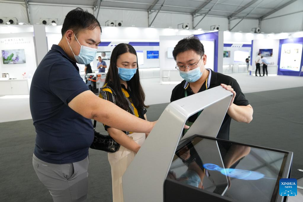 People experience holographic imaging technology at the main venue of 2022 national mass entrepreneurship and innovation week in Hefei, capital of east China's Anhui Province, Sept. 17, 2022. China holds a national mass entrepreneurship and innovation week from Sept. 15 to 21. Themed "Innovation drives vitality, entrepreneurship creates employment," the annual event, whose main venue is set in Hefei this year, is expected to see the launch of nearly 1,000 activities across the country, both online and offline. (Xinhua/Du Yu)