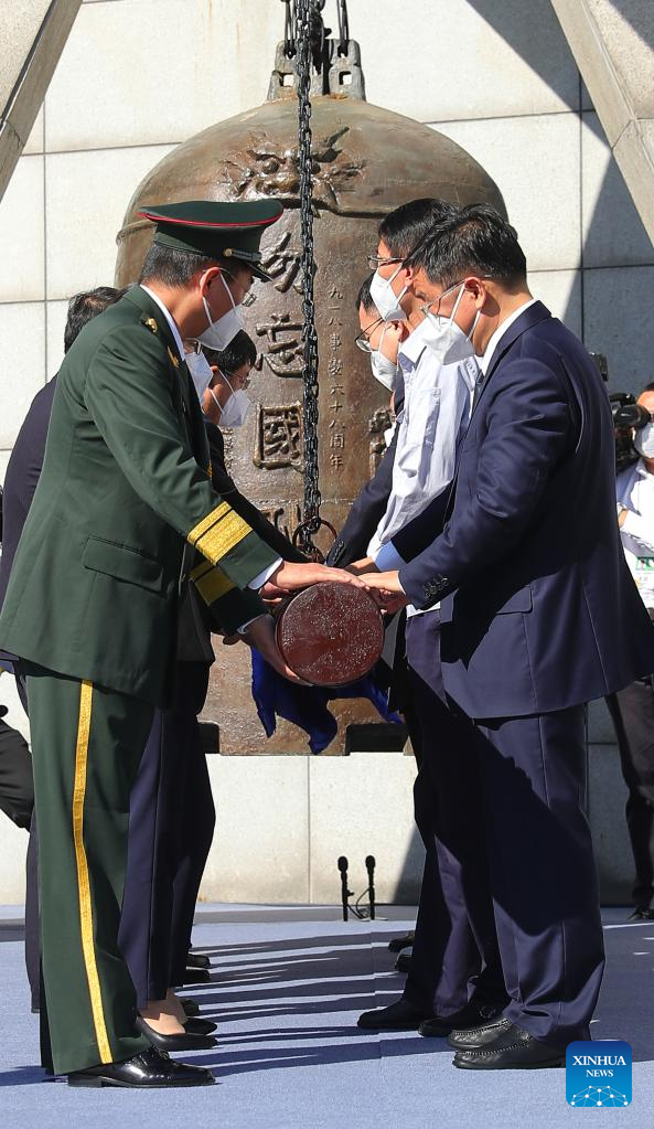 People strike a huge bell during a ceremony to commemorate the September 18 Incident and the Chinese People's War of Resistance against Japanese Aggression at the 9.18 Historical Museum in Shenyang, capital of northeast China's Liaoning Province, Sept. 18, 2022.