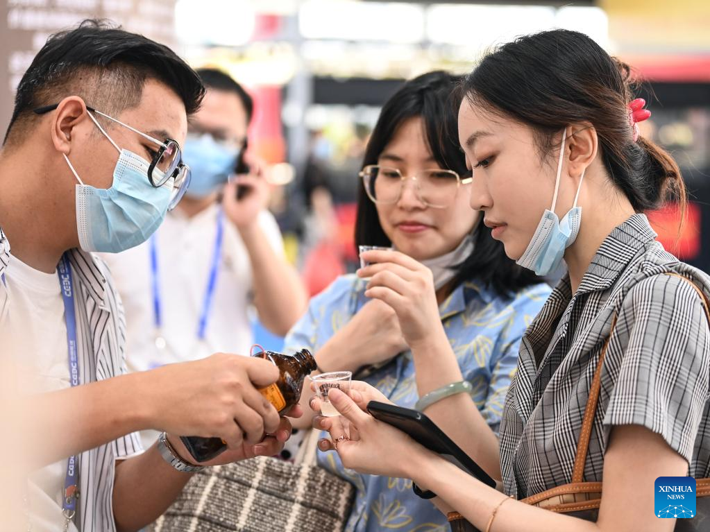 Visitors taste Japanese sake at the Japan pavilion during the 19th China-ASEAN Expo in Nanning, south China's Guangxi Zhuang Autonomous Region, Sept. 18, 2022. The four-day expo themed "Sharing RCEP New Opportunities, Building a Version 3.0 China-ASEAN Free Trade Area," will last till Monday as this year marks the first year of implementation of the Regional Comprehensive Economic Partnership (RCEP) free trade agreement. (Xinhua/Zhang Ailin)