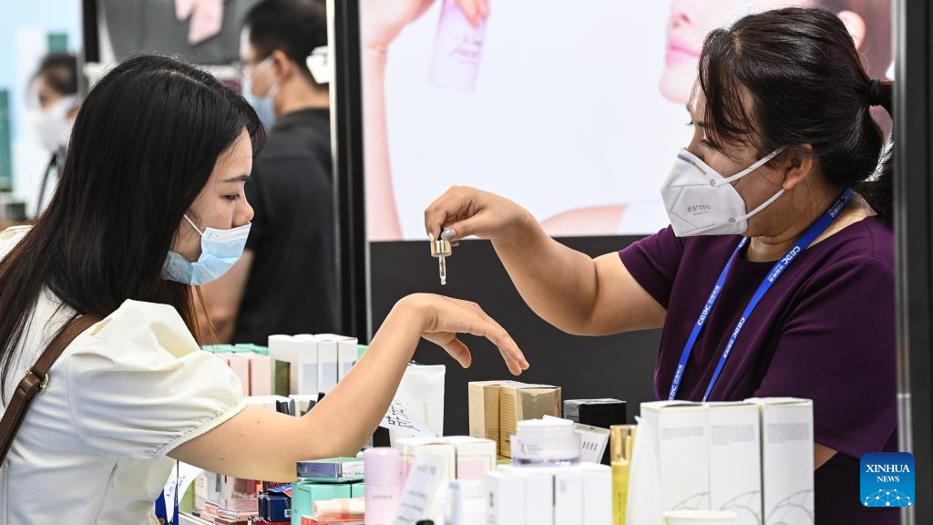 A visitor tries cosmetics at the South Korea pavilion during the 19th China-ASEAN Expo in Nanning, south China's Guangxi Zhuang Autonomous Region, Sept. 18, 2022. The four-day expo themed "Sharing RCEP New Opportunities, Building a Version 3.0 China-ASEAN Free Trade Area," will last till Monday as this year marks the first year of implementation of the Regional Comprehensive Economic Partnership (RCEP) free trade agreement. (Xinhua/Zhang Ailin)