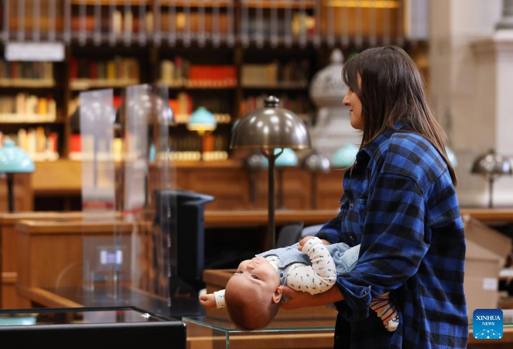 A woman carrying her baby visits the Richelieu French National Library in Paris, France, Sept. 17, 2022.