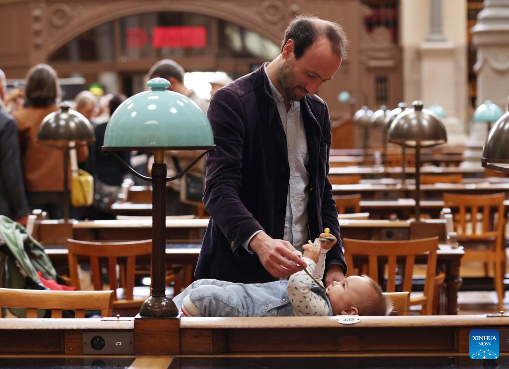 A man tends his baby at the Richelieu French National Library in Paris, France, Sept. 17, 2022.