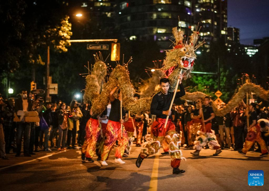 Dragon dancers perform during the Fire Dragon Festival at Chinatown in Vancouver, Canada, Sept. 17, 2022. (Photo by Liang Sen/Xinhua)