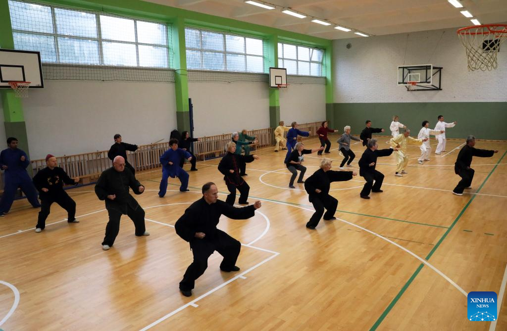 People practice Chinese Tai Chi in Vilnius, Lithuania, Sept. 18, 2022. Dozens of Tai Chi enthusiasts gathered in Vilnius on weekend to practice Tai Chi under the guidance of coach Wang Xiyin, who has been living in Lithuania for more than 30 years and is the Tai Chi coach in the past 20 years. (Photo by Yang Weihua/Xinhua)