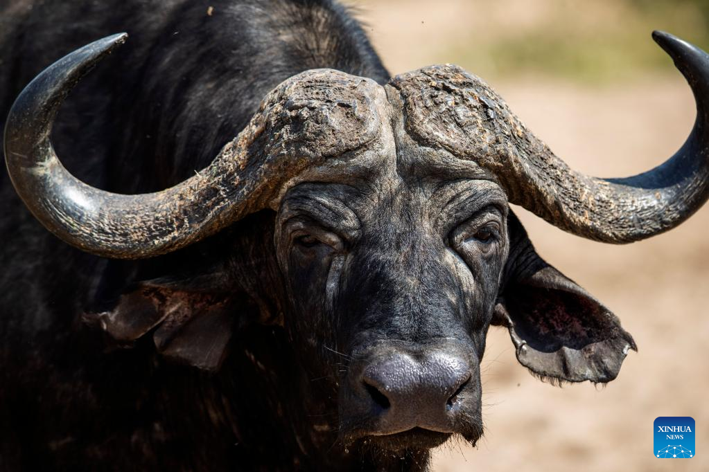 Photo taken on Sept. 17, 2022 shows an African buffalo at the Kruger National Park, Mpumalanga, South Africa. Kruger National Park is one of the largest game reserves in Africa. Covering an area of 19,485 square kilometers in northeastern South Africa, the park is a home to an impressive number of species. (Xinhua/Zhang Yudong)