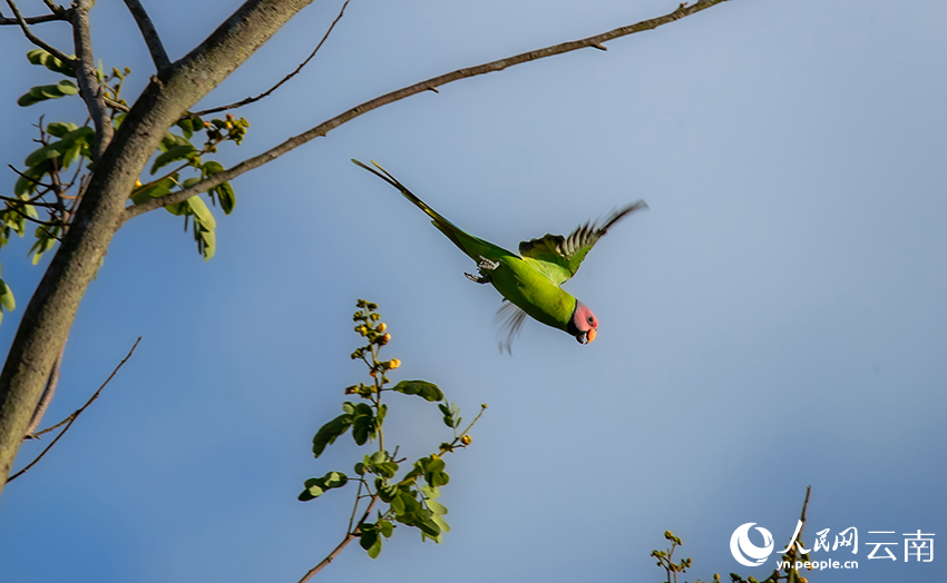 A blossom-headed parakeet flies in the sky. (Photo/Hu Xiaohong)