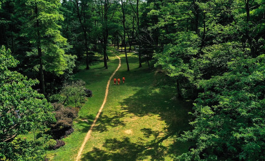 Aerial photo shows staff workers patrolling in Changpoling National Forest Park in Guiyang, southwest China's Guizhou Province, July 13, 2022. (Xinhua/Yang Wenbin)