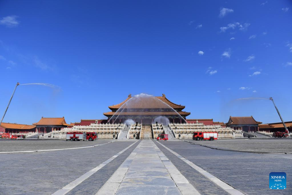 The drill was held to test and enhance fire prevention and emergency response capabilities at the ancient architectural complex. (Xinhua/Zhang Chenlin)