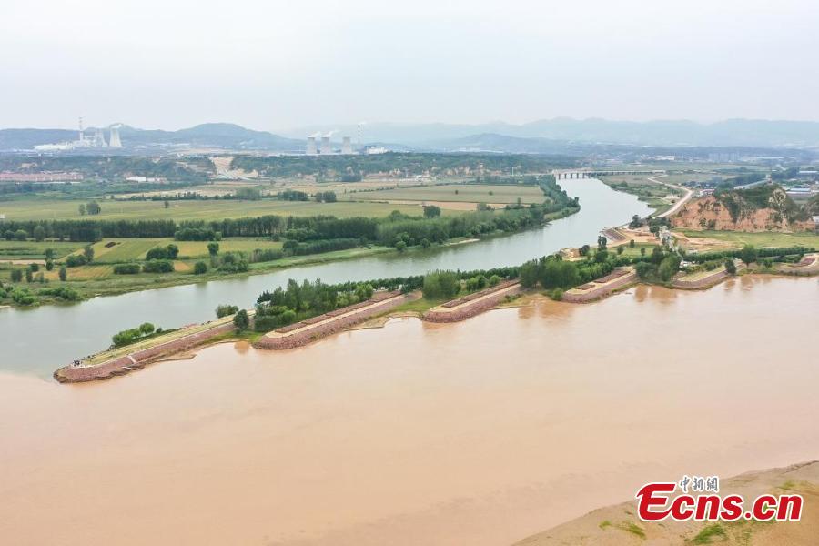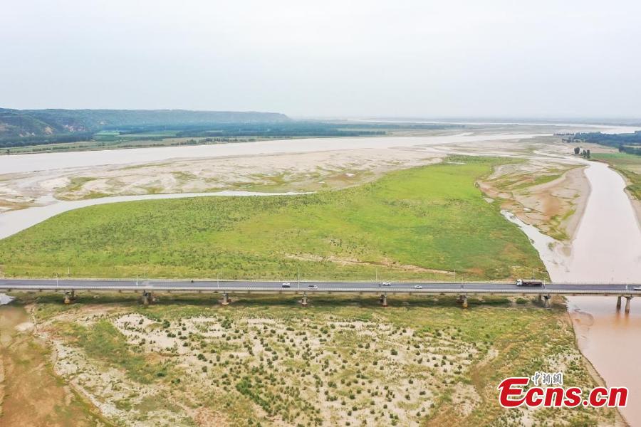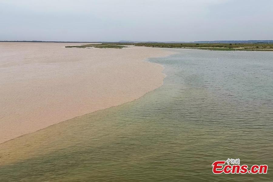 A clear boundary is formed between the colors of green and yellow on the intersection, where Luohe river joins the Yellow river in Gongyi, central China's Henan Province, Sept. 19, 2022. (Photo: China News Service/Wang Kewei)