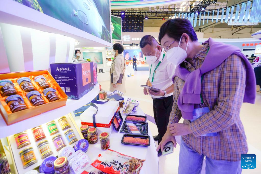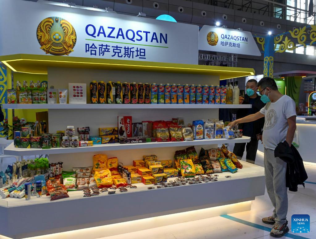 A visitor views commodities at the booth of Kazakhstan at the seventh China-Eurasia Expo in Urumqi, northwest China's Xinjiang Uygur Autonomous Region, Sept. 20, 2022.