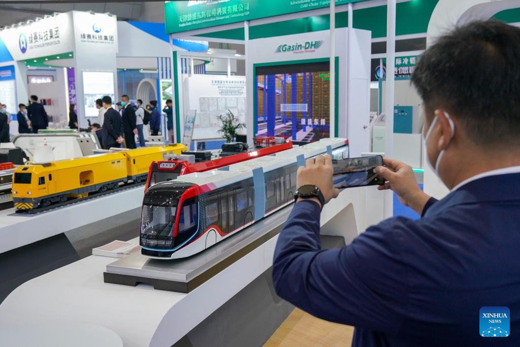 A visitor takes photos at the booth of China's leading train maker CRRC Corporation Ltd. at the seventh China-Eurasia Expo in Urumqi, northwest China's Xinjiang Uygur Autonomous Region, Sept. 20, 2022.